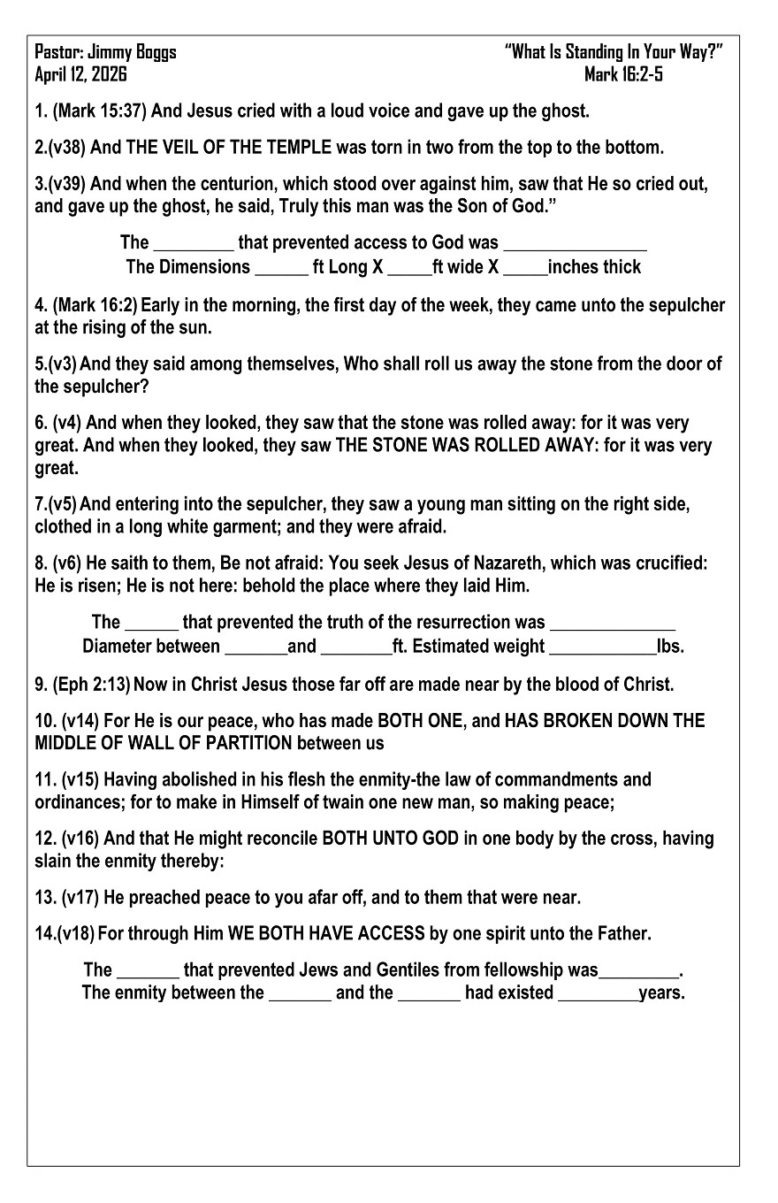 Message for April 12th: “What Is Standing In Your Way?” (Mark 16:2-5)
